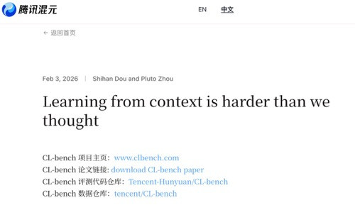 | “即使是如今最强的语言模型,在上下文的利用方面仍然做得不好,甚至可以说是还不会利用上下文,从上下文中学习。”2月3日,腾讯混元官网技术博客(TencentHYResearch)发表了一篇名为《从上下文中学习,远比我们想象的要难》的文章,系统的介绍了腾讯混元团队联合复旦大学的一项新研究。 这是姚顺雨加入腾讯担任首席AI科学家后团队首次发布研究成果,也是腾讯混元技术博客首次公开。这一博客的推出,旨在分享腾讯混元研究员在前沿技术研究和实践中的探索与经验,呈现创新思路与技术洞察。 详情见:https://hy.tencent.com/research